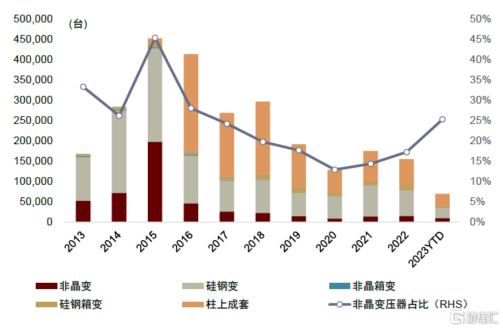 非晶合金变压器空载损耗低,招标占比稳步提升。2022年7月,工信部等六部门发布《工业能效提升行动计划》[9],要求到2025年新增高效节能变压器占比达到80%以上。非晶合金变压器的主要优势在于空载损耗低、运行稳定、寿命较长,但主要缺点在于噪音较大、价格偏高,更适用于配电变压器的应用场景。非晶合金立体卷铁心变压器能进一步降低空载损耗、空载电流,同时有效控制产品噪声。国网2023年配网协议库存配电变压器招标中,非晶变压器(含非晶箱变)数量占比稳步攀升至25%。