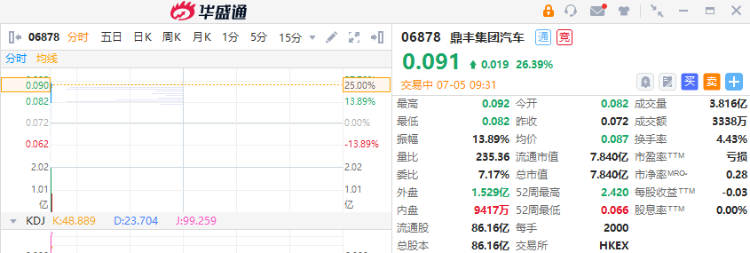 鼎丰集团汽车(06878)高开近14%,截至发稿,涨26.39%,报0.091港元,成交额3338万港元。
