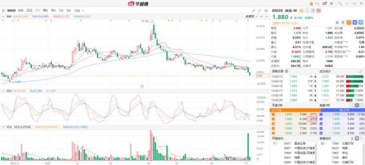 7月5日,商汤-W继续走低,截至发稿,股价跌5.53%,报1.87港元,刷新自去年10月以来的8个月新低。若和2022年上市初期9.70港元/股的历史新高相比,跌幅更是接近8成,市值蒸发3200亿港元。