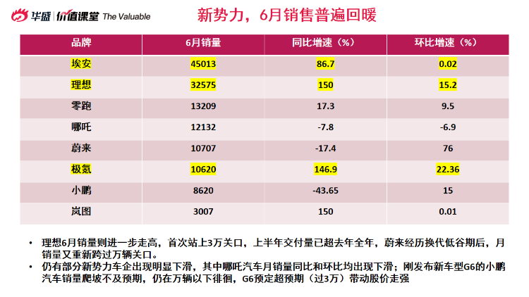 比亚迪在6月份的销售也创下历史新高,新能源汽车销量为25.3万辆,同比增长88.79%,与特斯拉的增幅相当。理想汽车今年表现最好,在每个月都保持稳定增长的态势,6月份交付量首次突破3万辆。小鹏汽车的交付数据也持续改善,虽然去年市场表现不佳,但最近G6预定量超过了3万台。