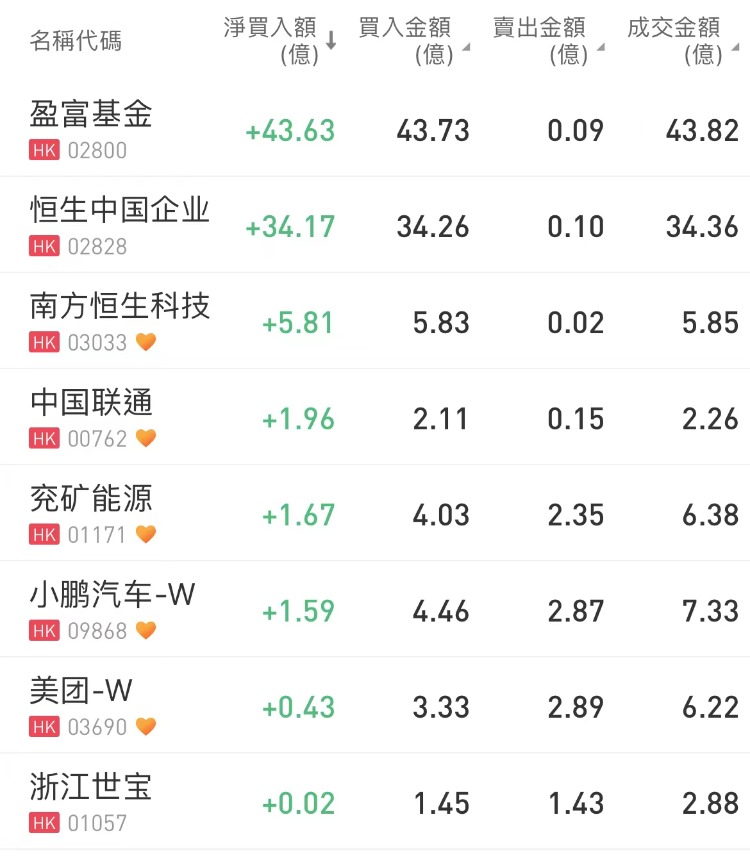 盈富基金、恒生中国企业、南方恒生科技分别获净买入43.63亿港元、34.17亿港元、5.81亿港元;建设银行净卖出额居首,金额为1.83亿港元。