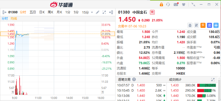 中国金石持续走高,截至发稿,涨21.85%,报1.45港元,成交额185.6万港元。公司股价连续四个交易日大涨242%。