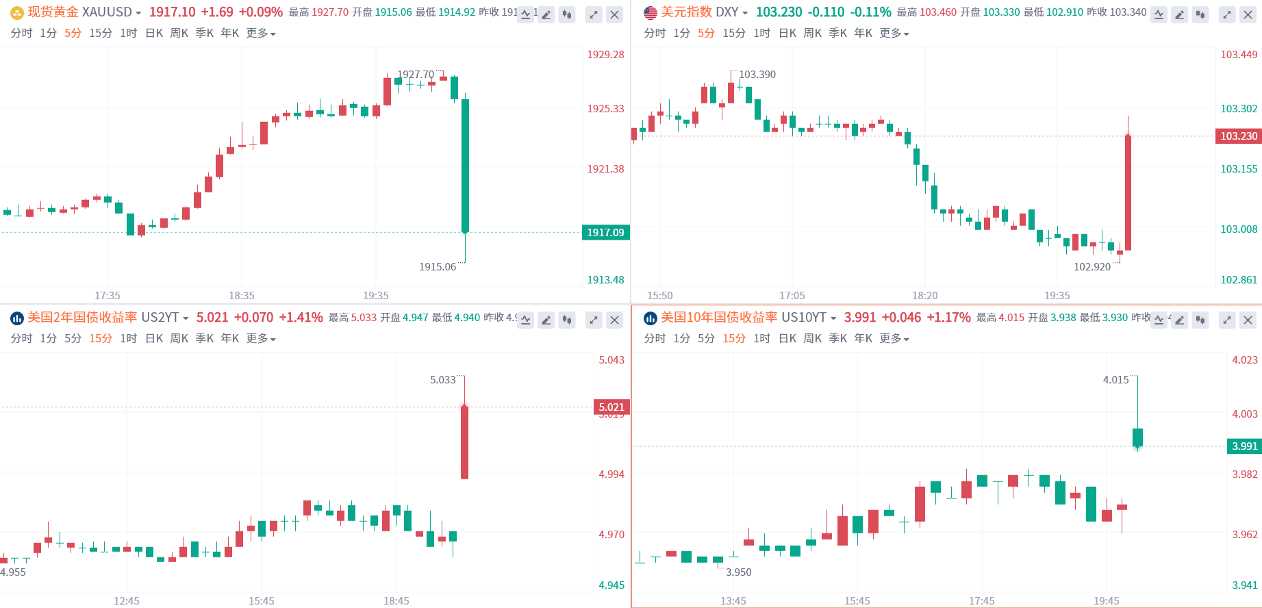 数据公布后,现货黄金短线跳水超10美元;美国两年期国债收益率 $ZTmain 升破5%,接近2023年的高点;美国10年期国债收益率 $ZNmain 自三月以来首次上升至4%。