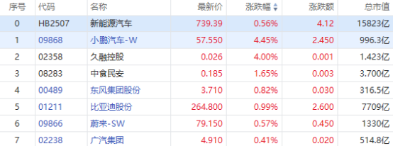 7月6日,港股新能源汽车板块逆市拉升,小鹏汽车-W一度涨超6%,截至发稿,小鹏汽车-W涨超4%,东风集团股份、比亚迪股份涨近1%,蔚来-SW、广汽集团跟涨。