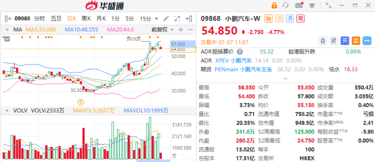 一则券商研报引发小鹏汽车股价走低,盘中一度跌超5%,截至发稿,小鹏汽车跌4.77%,报54.8港元。