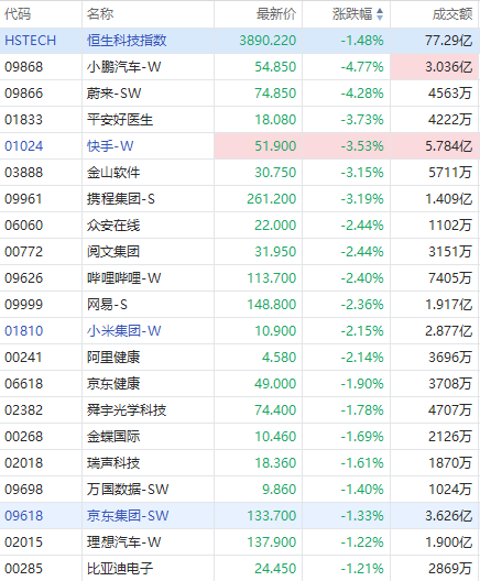 个股方面,小鹏汽车、蔚来跌超4%,平安好医生、快手、金山软件跌超3%,众安在线、阅文集团、哔哩哔哩、小米跌超2%,京东健康、京东、理想汽车跌超1%;阿里巴巴逆势走高。