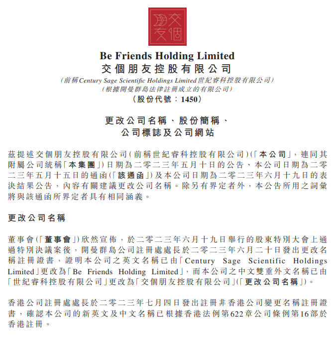 7月6日,世纪睿科发布公告,公司用作于联交所进行证券买卖的英文及中文股份简称分别将由“CENTURY SAGE”及“世纪睿科”更改为“BE FRIENDS HLDG”及“交个朋友控股”,自2023年7月11日上午九时正起生效。公司的股份代号维持不变为“1450”。