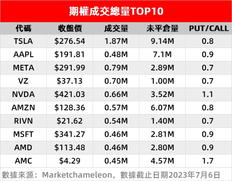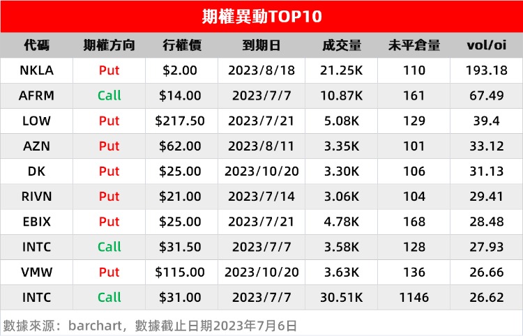 2、Threads注册用户突破3000万,富国银行表示其将为Meta $META 带来3%的营收。个股隔夜收跌0.81%。期权方面,7月7日到期的期权合约增长超4.7万张,最为活跃。隔夜看跌期权成交1.15亿美元。