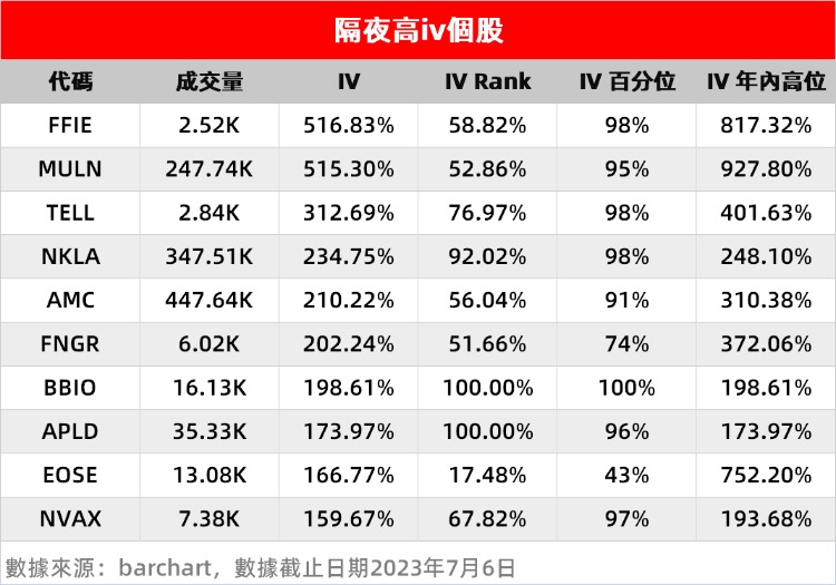 1、美国电动汽车公司Mullen Automotive $MULN 隔夜续升超29%,隔夜期权总成交放量增至24.8万张。隐波率环比微降至515.3%,IV百分位95%。