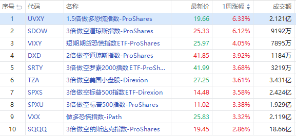 指数ETF方面,本周涨幅居前的为做多恐慌指数ETF。其中,1.5倍做多恐慌指数ETF-ProShares $UVXY 本周涨6.33%,3倍做空道琼斯指数ProShares$SDOW 涨6.12%,短期期货恐慌指数ETF-ProShares $VIXY 涨4.05%,2倍做空道琼斯指数-ProShares $DXD 本周涨3.92%。