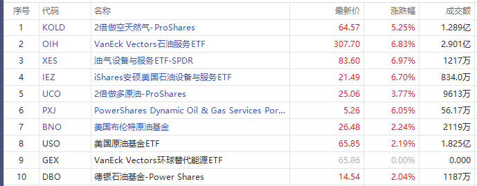 能源ETF方面,VanEck Vectors石油服务ETF $OIH 涨6.99%,油气设备与服务ETF-SPDR $XES 涨6.95%,iShares安硕美国石油设备与服务ETF $IEZ 涨6.81%。