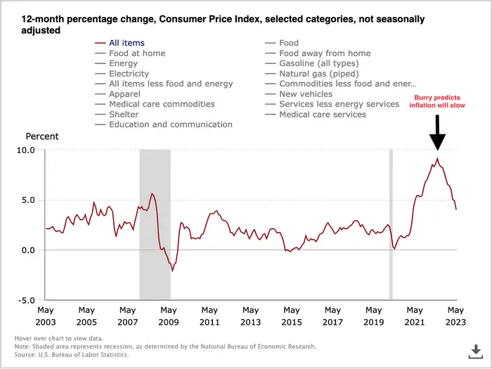 事实上,到去年12月,CPI年率已放缓至6.5%。今年年初,贝里再次发声,预测通胀将继续下降。到目前为止,他一直是正确的,因为5月份美国CPI年率已经放缓至4%。