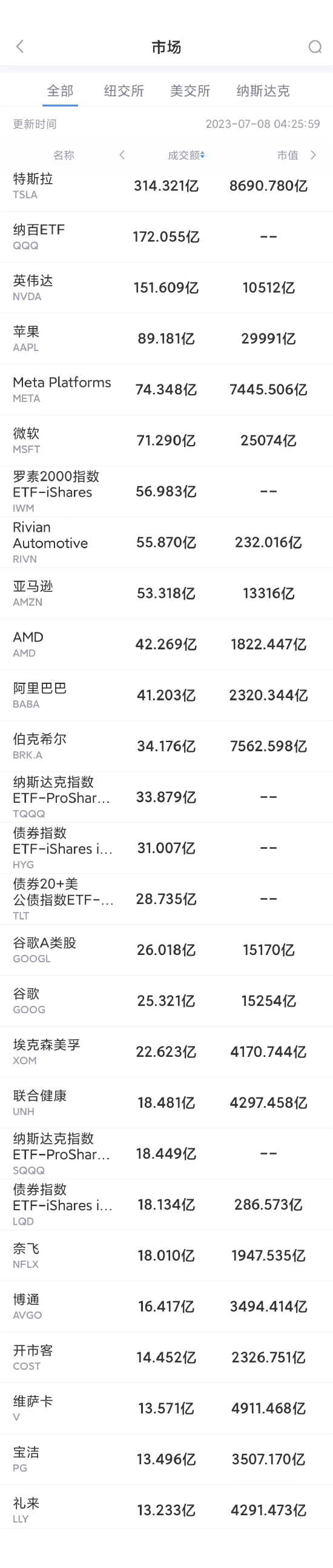第4名Meta Platforms收跌0.5%,成交74.3亿美元。当地时间周五(7月7日),扎克伯格在Threads上表示:“截至今天早上,Threads网站注册用户达到7000万,远远超出了我们的预期。”