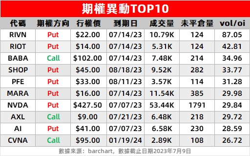 2、市场资金上周五涌入Riot Blockchain $RIOT ,该股周五大涨14.33%。其中,行权价14美元,7月14日到期的Put单,当日成交量近5.5千张。