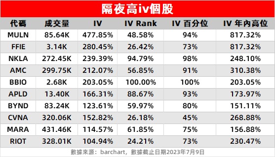1、美国电动汽车公司Mullen Automotive $MULN 上周五回落近13%,隔夜期权总成交为8.56万张。隐波率环比微降至477.85%,IV百分位94%。值得留意的是,该股过去一周曾暴涨78%。