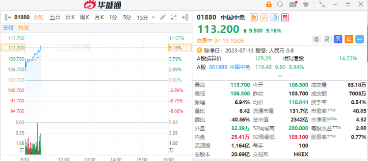 7月10日讯,中国中免(01880)反弹回升,并回归10天线上方,截至发稿,报113.20港元,涨9.16%。另外,对应A股中国中免(601888)同步上扬,报119.49元人民币,涨8.92%。