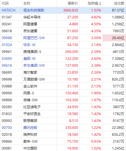 个股方面,华虹半导体、阿里健康、京东健康涨超4%,阿里巴巴-SW、快手-W涨超3%,美团-W、万国数据-SW、金山软件涨超2%,微博-SW、平安好医生、腾讯控股涨超1%。