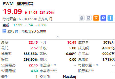 次新股盛德财富盘前跌逾8%,该股隔夜收高281.08%。盛德财富通过其运营子公司主要为亚洲的高净值和超高净值人士提供财富管理和资产管理服务。