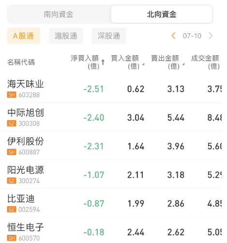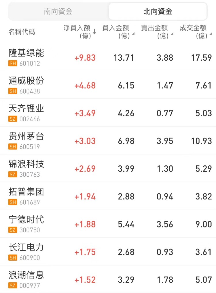 北向资金净买入12.30亿元,隆基绿能、通威股份、天齐锂业分别获净买入9.83亿、4.68亿、3.49亿元;海天味业遭净卖出2.51亿元。
