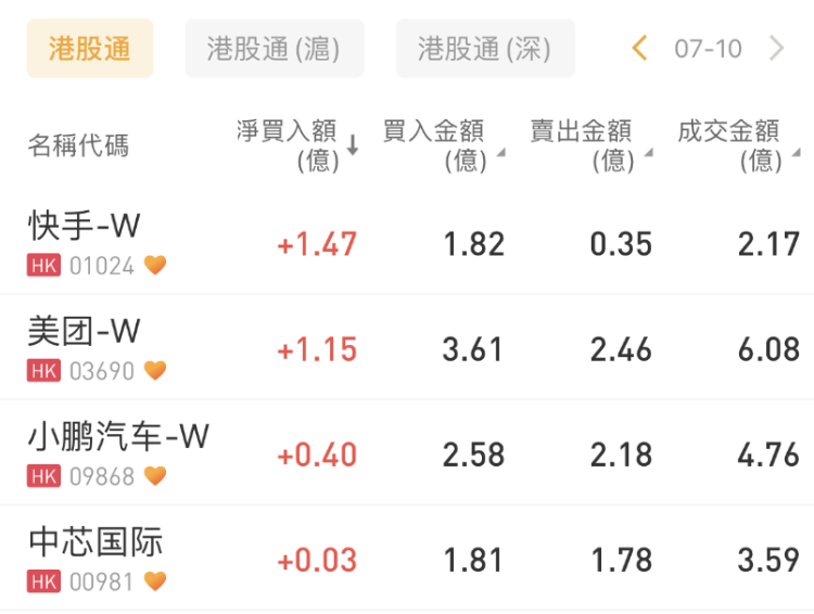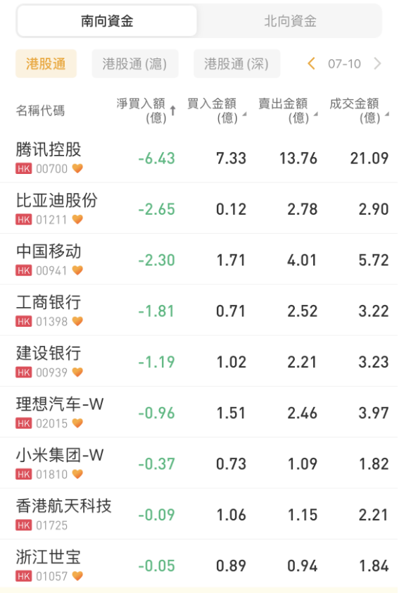 腾讯控股、比亚迪股份、中国移动分别遭净卖出6.43亿港元、2.65亿港元、2.30亿港元;快手-W、美团-W获净买入1.47亿港元、1.15亿港元。