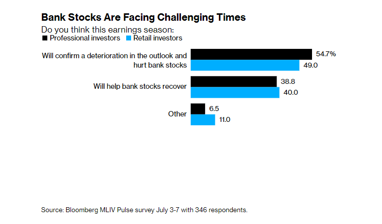 摩根大通、花旗集团和富国银行将于7月14日正式发布财报。约53%的受访者预计银行和贷款机构的收益将令人失望,本季度的财报将证实银行业前景恶化,并损及其股价。