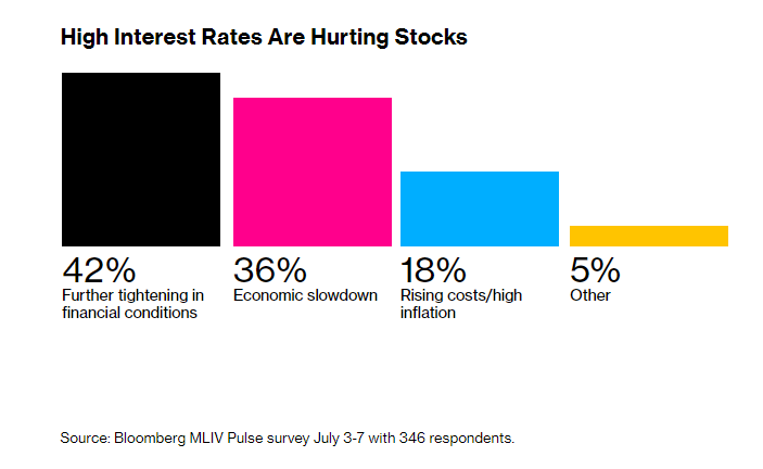 42%的受访者表示,财报季最大的负面因素将是金融环境进一步收紧的影响。上周五公布的就业数据显示,6月非农新增岗位不及预期,但薪资增长强于预期,市场对美联储7月将加息的押注仍很高。
