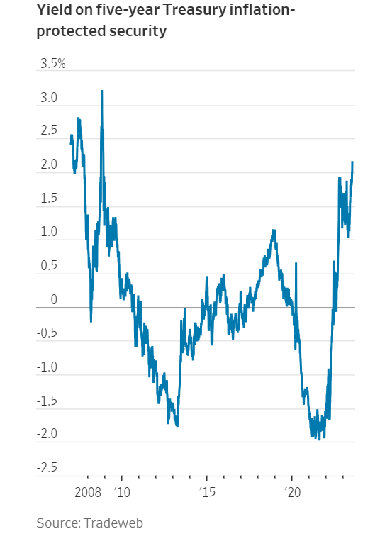 即便如此,弹性的经济实力已经导致投资者提高了他们对通胀调整后的实际利率需要攀升到更高才能控制物价的估计。这可以从TIPS的收益率中看出来,目前该债券已达到10多年来的最高水平。