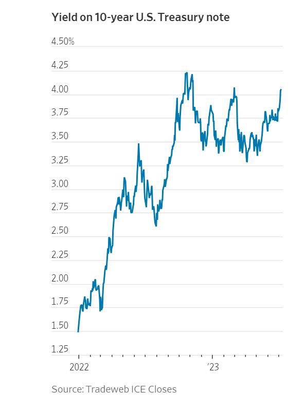 当10年期美国国债收益率在去年秋天和今年3月首次突破4%时,令人沮丧的通胀报告提振了收益率。