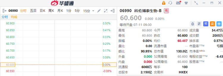 华盛资讯7月11日讯,生物科技公司科伦博泰生物-B今日挂牌港交所上市,股价平开,盘前成交额2085万港元,最新总市值超130亿港元。