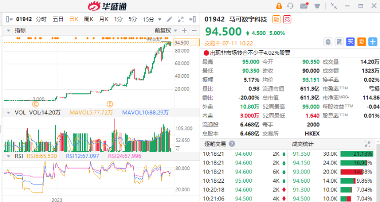 马可数字科技(01942)早盘直线拉升5%,截至发稿,报94.5港元,成交额1323万港元。