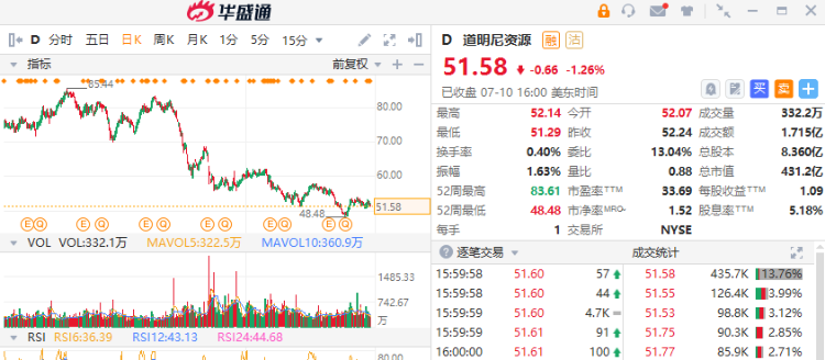 截至发稿,道明尼资源盘后涨0.43%,至51.8美元。