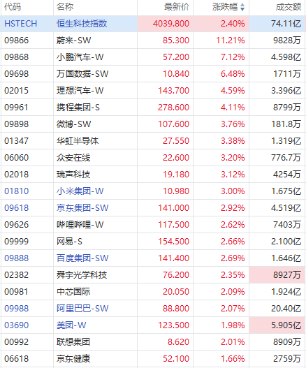 个股方面,蔚来涨超11%,小鹏汽车涨超7%,万国数据涨超6%,理想汽车、携程集团涨超4%,华虹半导体、众安在线、瑞声科技涨超3%,京东、哔哩哔哩、网易、百度、中芯国际、阿里巴巴涨超2%。