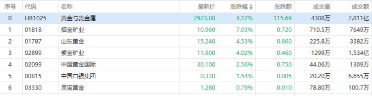 7月11日,港股黄金股盘中集体拉升,截至发稿,招金矿业涨超7%,紫金矿业、山东黄金涨超4%,中国黄金国际涨2.56%。