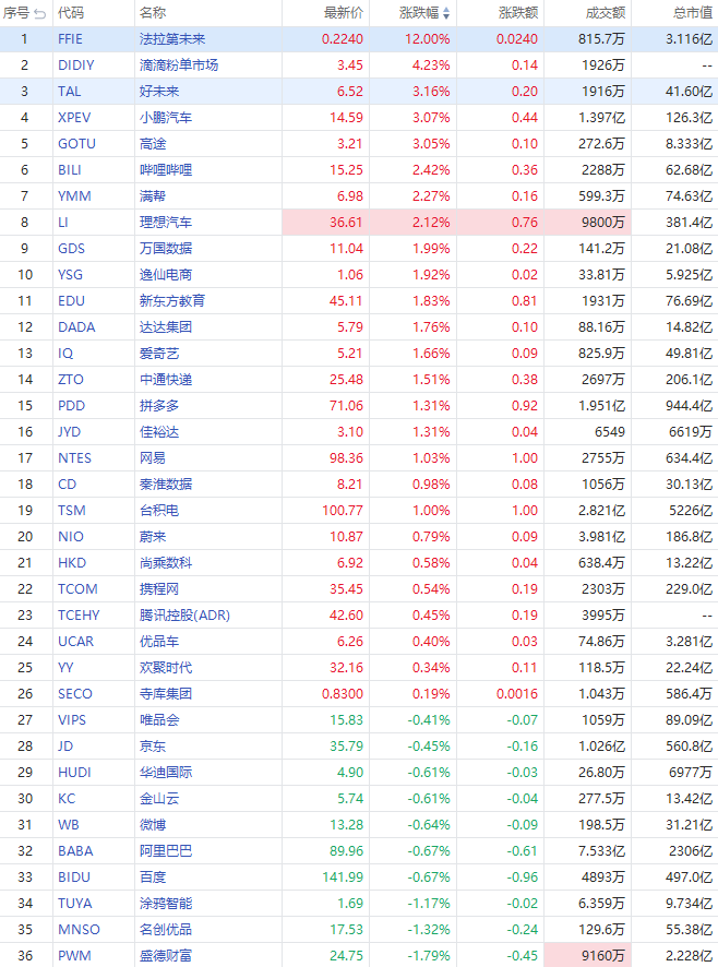 盘面上,中概教育股续涨,高途涨超3%,新东方教育近2%。汽车股方面,小鹏汽车盘中升7%,现回落涨3.07%;理想汽车涨2.12%,蔚来微涨。