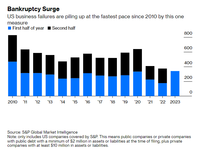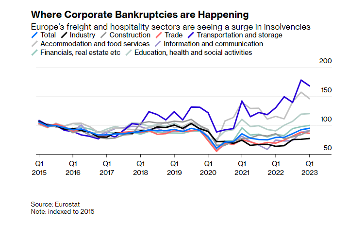 规模更大的破产也在发生,比如在美国上市的家居用品巨头Bed Bath & Beyond Inc.今年4月申请破产。奥地利家具零售商Kika/Leiner上个月倒闭,是该国10年来最大的破产案。大规模的违约增加了恶性循环的风险,一旦供应商得不到报酬,工人将失业,银行将进一步收紧贷款标准,然后就会有更多的公司破产。