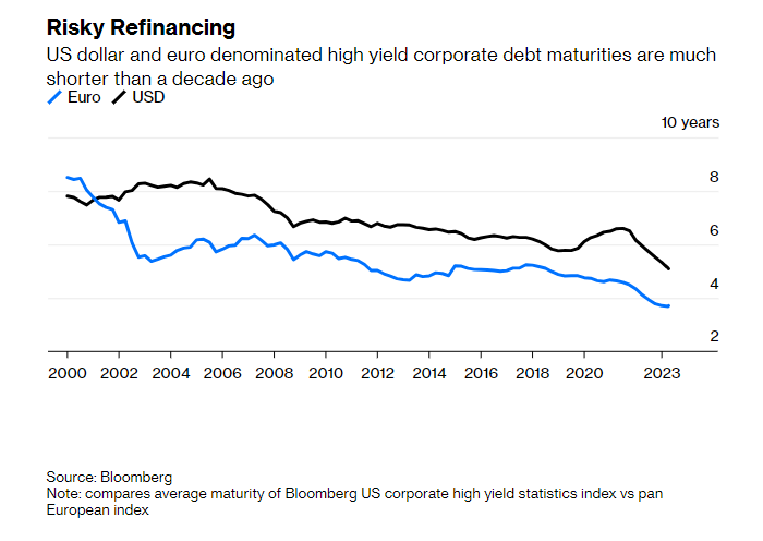 企业高管们一定希望利率能迅速回到可管理的水平,但这看起来越来越不可能。与此同时,美国和欧洲垃圾债券的平均到期日已降至历史最低水平。虽然今年没有太多高风险债务到期,但此后的再融资挑战将变得更加艰巨,企业可能会决定尽早重组债务,从而提前应对这一问题。