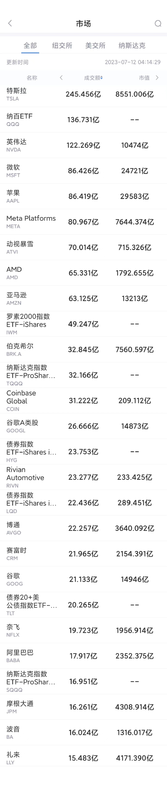 第3名微软收高0.19%,成交86.43亿美元。7月11日,微软以690亿美元收购动视暴雪的交易赢得了美国法院的批准,击败了美国联邦贸易委员会(FTC)阻止有史以来最大的游戏行业收购交易的努力。