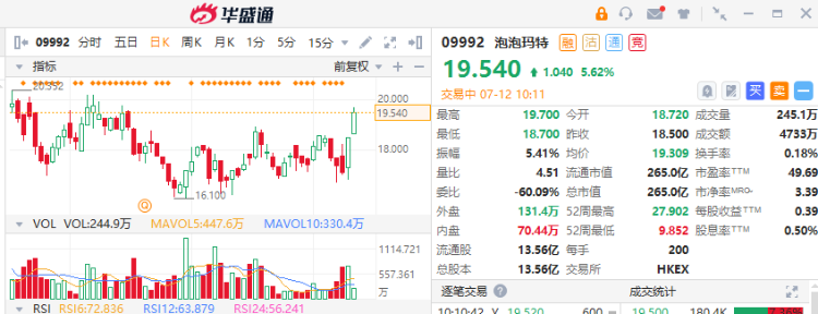7月12日讯,泡泡玛特(09992)早盘一度涨超6%,截至发稿,涨5.62%,报19.54港元,成交额4733万港元