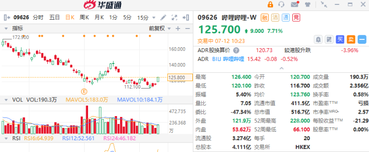 7月12日讯,哔哩哔哩-W(09626)涨超7%,截至发稿,涨7.28%,报125.2港元,成交额1.54亿港元。