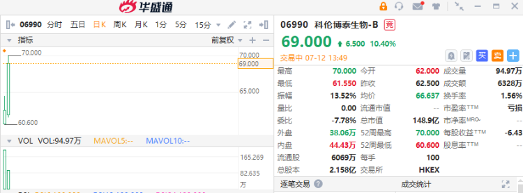 7月12日讯,昨日挂牌上市的科伦博泰生物-B受市场追捧,首日收涨超3%,截至发稿今日再升超10%,最新总市值超148亿港元。