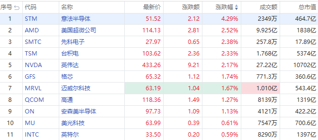 美股半导体板块续升,意法半导体涨超4%,先科电子、AMD、台积电涨逾2%,高通、迈威尔科技跟涨。