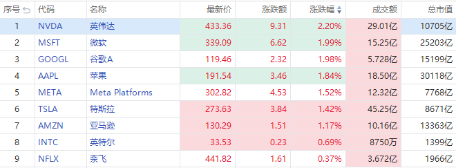 明星科技股普涨,英伟达涨2.2%报433.36美元,微软涨近2%,特斯拉涨1.42%,苹果、谷歌涨逾1%,英特尔、亚马逊跟涨。