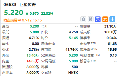 华盛资讯7月12日讯,“周杰伦概念股”巨星传奇正在暗盘交易,截至发稿涨22%,中签一手账面浮盈约500港元,最新总市值超40亿港元。