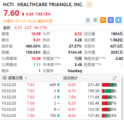 涨幅榜方面,医疗保健IT平台Healthcare Triangle $HCTI 早盘拉升大涨,截至发稿涨133.13%报7.6美元每股,成交额1.56亿美元。该股盘前收涨94.17%。