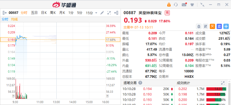 英皇钟表珠宝早盘一度放量升24%,截至发稿,涨17.68%,报0.193港元,成交额251.6万港元。