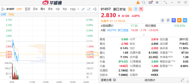 7月13日讯,浙江世宝(01057)跌超5%,截至发稿,跌4.07%,报2.83港元,成交额7164万港元。