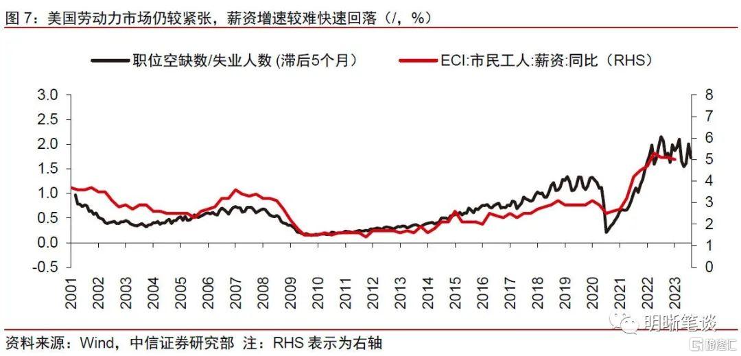 虽然6月核心服务项通胀环比从0.4%小幅放缓至0.3%,但近期美国房地产市场回暖,薪资增长增速不减,未来核心服务项通胀下行的可续性存疑。在供给紧张与需求回暖的双重推动下,近期美国房价出现一定反弹迹象,因而尽管当前住房项通胀环比增速放缓,并且预计其同比增速预计已见顶,但预计住房项通胀未来放缓幅度或偏小,未来住房项通胀对核心服务项通胀下行的推动作用有限。同时,虽然6月新增非农就业人数回归此前下降趋势,显示出美国劳动力市场出现一定松动,但薪资增速黏性超预期,职位空缺率仍处于较高水平,预计短期内薪资增速对核心服务项通胀仍具有支撑。