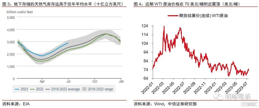 6月食品项环比继续保持在低位,能源项环比正增长,预计未来食品项和能源项对于美国整体CPI下行的阻碍较弱。6月家庭食品环比零增长,较多细分项录得环比负增长,非家用食品环比增速进一步放缓至0.4%。由于当前全球谷物价格仍在下行,并且美国近期爆发的高致病性禽流感对家禽数量的影响较轻,叠加持续处在低位的运费价格,因而预计美国整体食品通胀同比增速将进一步下行。据美国农业部(USDA)2023年6月预测数据显示,2023年食品通胀年度增速或为6%,预测区间为5.0%-7.1%。而能源方面,在当前欧美经济趋弱但仍具有一定韧性背景下,预计短期原油价格将表现为震荡。若欧美经济衰退兑现,全球经济复苏乏力,则预计届时原油价格将进一步下行。此外,天然气在高库存背景下预计较难出现大幅反弹,因而预计能源项通胀对于整体CPI增速下行的阻碍将较低。