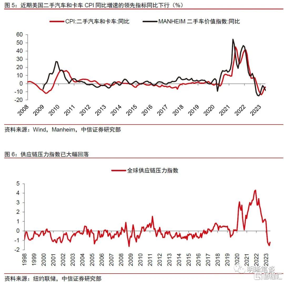 虽然6月核心商品通胀同比增速大幅下降至-0.1%,但当前美国消费仍具韧性,短期商品通胀仍存在环比反弹的风险,中长期商品项通胀环比预计将在0%增速附近波动。6月核心通胀负增长主要得益于二手汽车和卡车项、家用家具和供给项、娱乐商品通胀环比负增长。当前作为二手汽车和卡车价格领先指标的MANHEIM二手车价值指数环比仍处在负增长区间,预计未来二手汽车和卡车项CPI将进一步下行。然而当前美国商品消费仍具有一定韧性,消费者信心在通胀下行以及实际薪资反弹的背景下也有所上升,因而预计短期需求端对商品通胀下行仍存在一定阻碍,但中长期而言,随着未来美国劳动力市场趋弱,商品需求将趋势性放缓,因而预计中长期商品项通胀环比仍将回归0%附近波动运行。