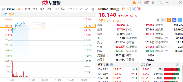 华盛资讯7月13日,海底捞涨超4%市值重上千亿港元,呷哺呷哺涨超3%,九毛九、奈雪的茶、百胜中国涨超2%。